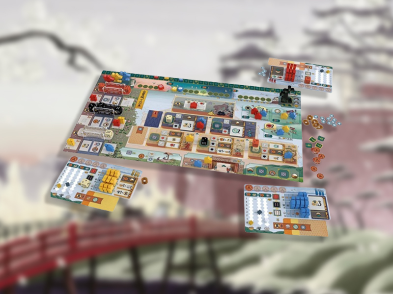 El panel central muestra el Castillo Himeji en todo su esplendor, dividido en varias zonas. El mayor se encuentra en el interior del castillo, con la Sala de las Mil Alfombras, donde los cortesanos deben ascender socialmente hasta llegar al círculo más cercano al Daimio para disfrutar de su favor. También está el estanque y los jardines, cuidados pacientemente por los jardineros, donde todos pueden relajarse y contemplar su belleza sin restricciones. Otra zona importante es la muralla y el exterior del castillo, donde los guerreros patrullan y hacen guardia. Finalmente, encontramos la zona de los tres puentes, donde se acumulan los tres tipos de dados que pueden usarse para realizar acciones, y el dominio personal de cada jugador, donde llevará la cuenta de sus recursos y donde tendrá la reserva de trabajadores.